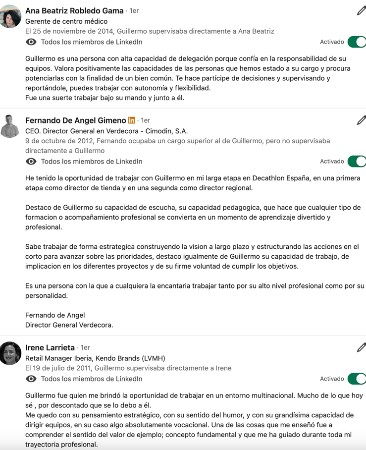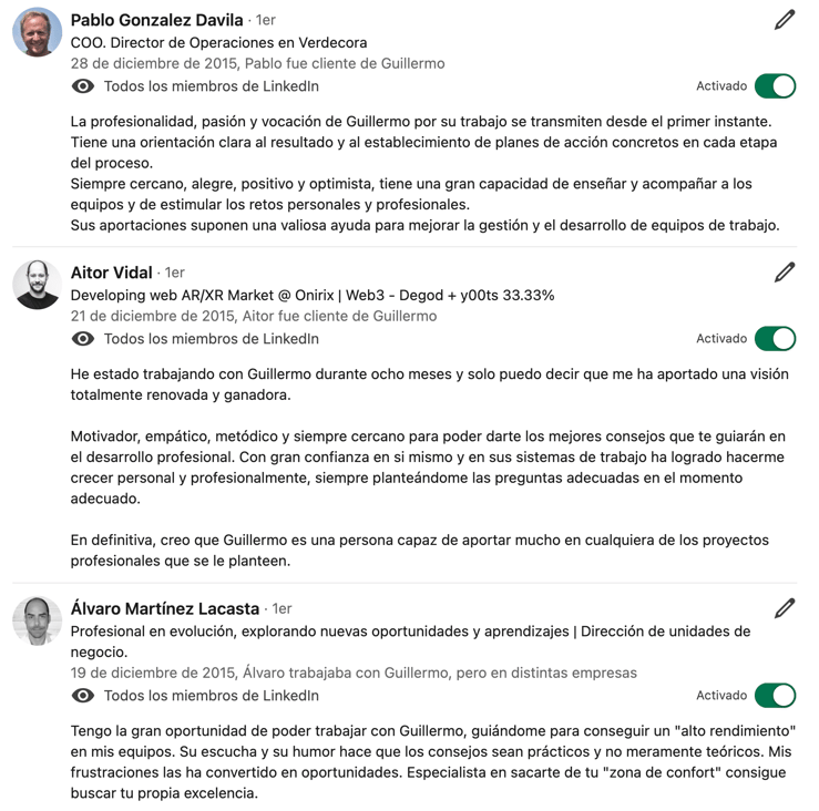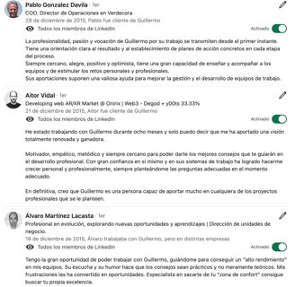Guillermo es un gran profesional, gracias a sus clases amplié mi perspectiva sobre management de equipos y aprendí muchísimo. Desprende muy buena energía al grupo al que da clase. Lo recomiendo confiando 100% en su trabajo.Guillermo es un gran profesional, gracias a sus clases amplié mi perspectiva sobre management de equipos y aprendí muchísimo. Desprende muy buena energía al grupo al que da clase. Lo recomiendo confiando 100% en su trabajo.